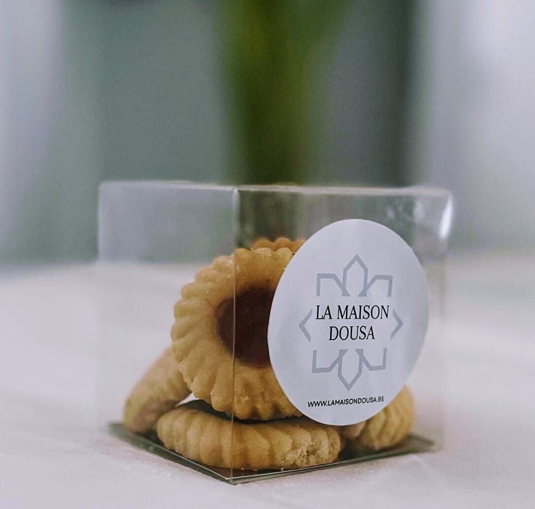 Onze zandkoekjes met jamvulling combineren de smeuïge zachtheid van boterrijk deeg met een verfijnde toets van fruitige luxe. Elk koekje is met de hand gevuld met een fluweelzachte jam – zorgvuldig geselecteerd voor haar rijke smaak en natuurlijke zoetheid – en omsloten door een licht kruimelende zandkoek die smelt op de tong.